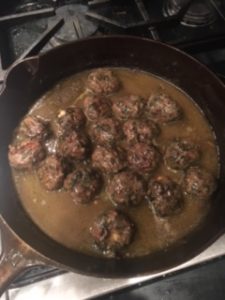 Mixed the lamb with the filling and rolled it into small meatballs. Browned the meatballs in a cast iron pan. The feta, where it was on the outside of the meatball, formed a lovely crust. Took out the meatballs and strained off the fat. Deglazed the pan. There were lots of delicious brown scraps. Made a light roux, stirred it into the broth for a little thickening. Salt and pepper to taste.
